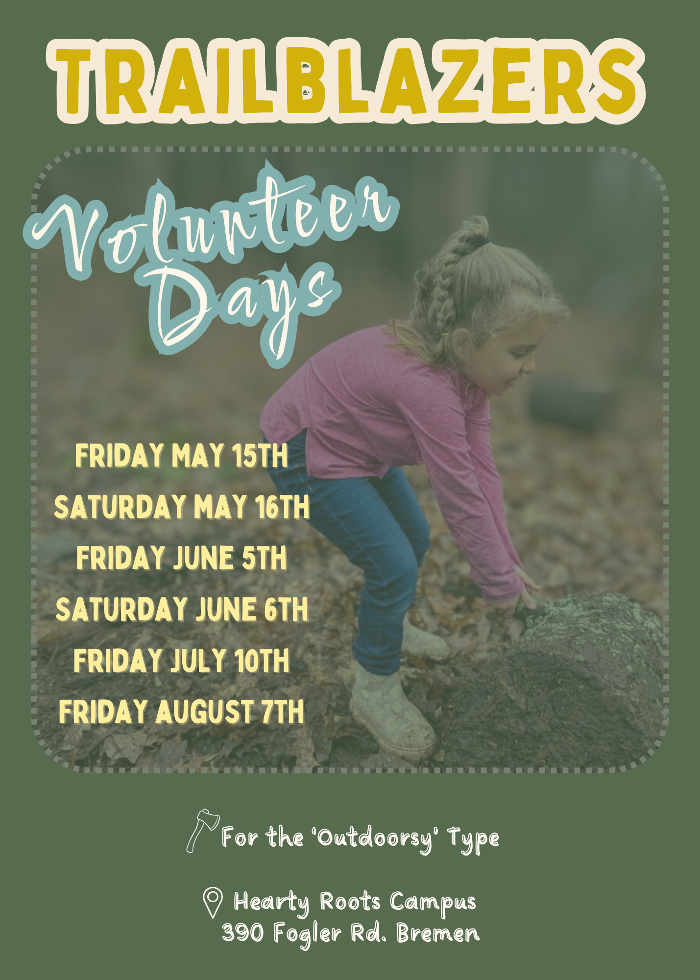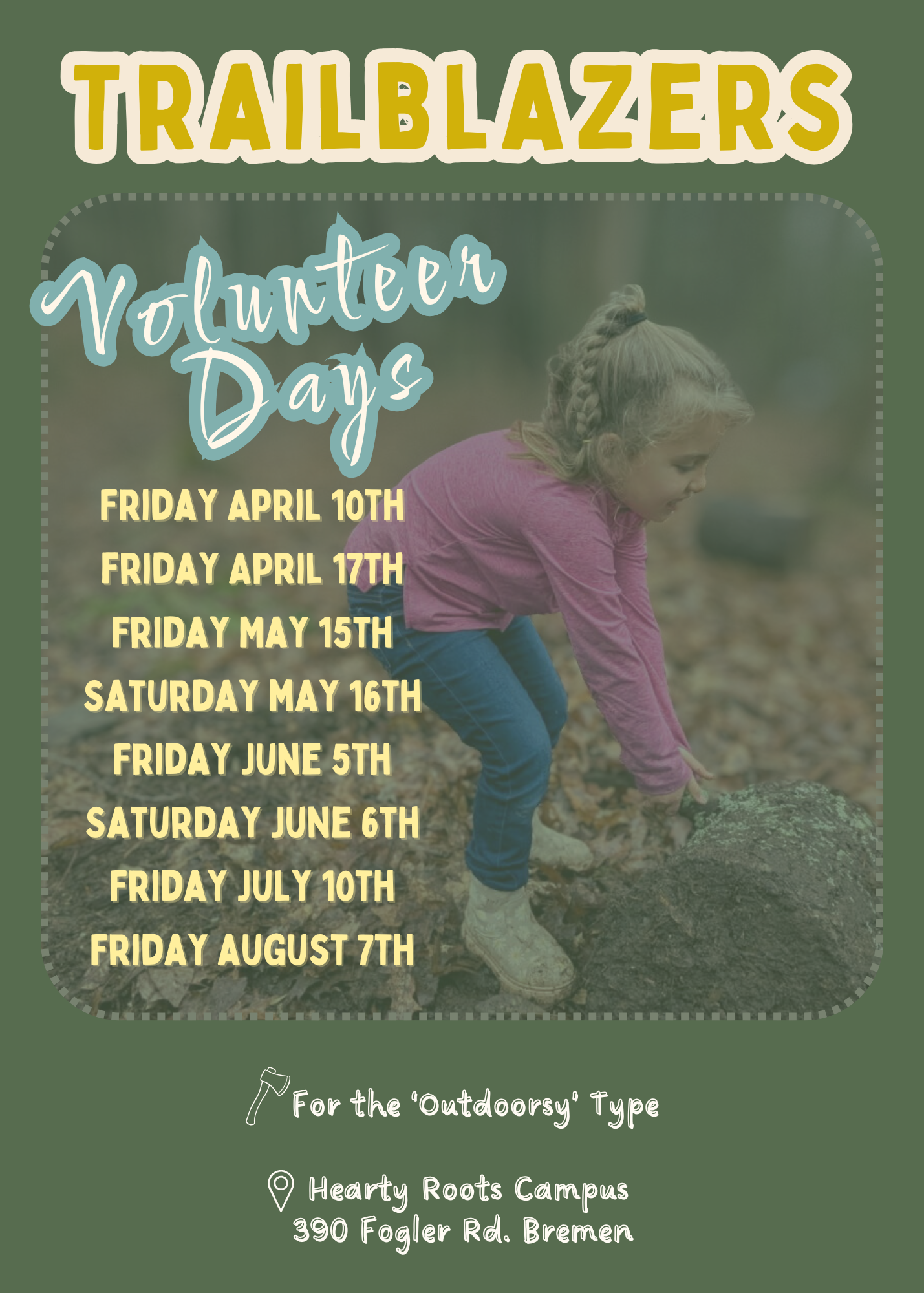 Trailblazers are volunteers who meet us at our Campus for helping out with manual labor tasks on our forested grounds. Show up between 9am and 2pm.